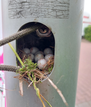 Durch einen fehlenden Deckel ist eine Kohlmeisen-Familie in einen Fahnenmast eingezogen. Wir konnten das Vogelnest durch ein eingezogenes Seil vor dem Abrutschen sichern.